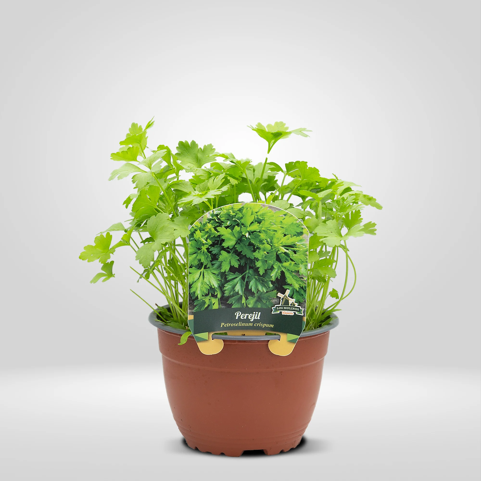 El perejil (Petroselinum crispum) es una de las hierbas aromáticas más utilizadas en cocina, apreciada por su sabor fresco y sus propiedades digestivas. Cultivado en maceta de 15 cm, desarrolla una planta frondosa y productiva, ideal para cortar hojas de manera progresiva durante varias semanas. Se adapta perfectamente a balcones, macetas y pequeñas huertas.