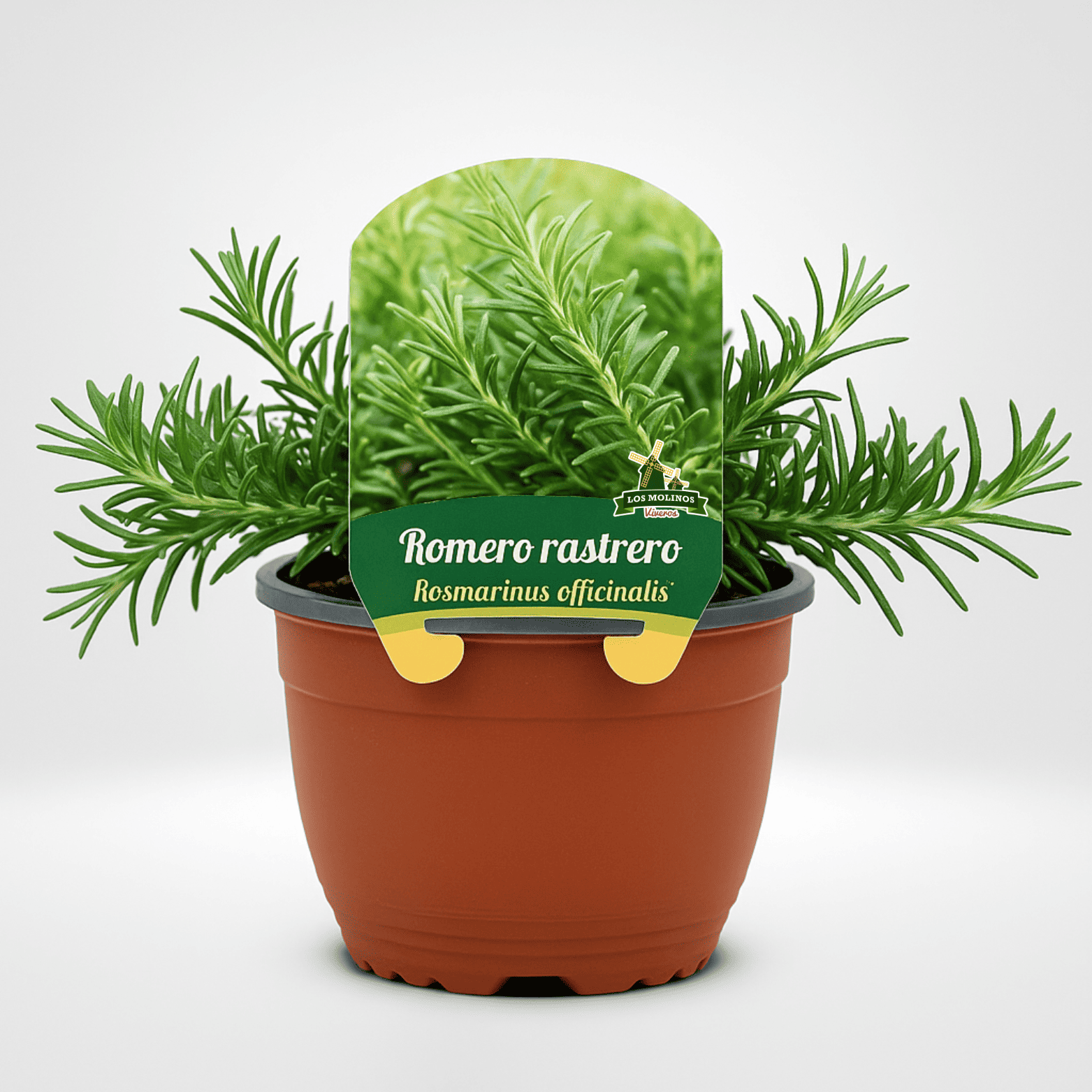 El romero rastrero (Rosmarinus officinalis ‘Prostratus’) es una variedad de crecimiento horizontal, ideal para colgar, cubrir superficies o adornar bordes de jardineras.